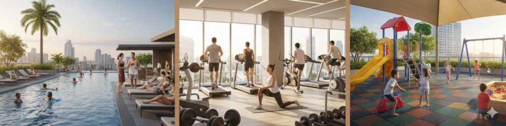 Dedicated features on the 7th Floor Amenity Level include: Swimming Pool (adult and kids), Fitness Gym & Yoga Studio, Daycare, Garden, Indoor & Open Lounge, Daycare, Play Area, Function Rooms, Coffee Shop with Outdoor Lounge, Open Bar